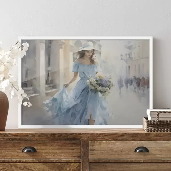 Poster Een elegant meisje in een lichtblauwe jurk en hoed wandelt door de stad, met een boeket bloemen in de hand, in een lichte en romantische stemming. Nr f42580
