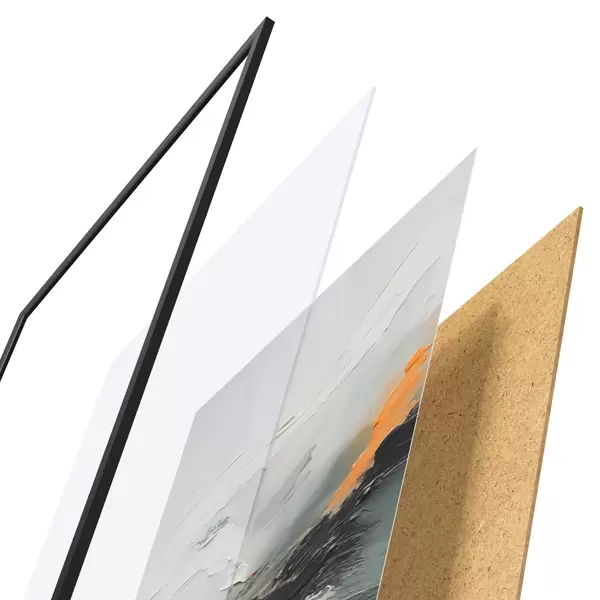 De poster bestaat uit een frame, plexiglas, geprinte afbeelding en spaanplaat achterkant. De poster kan meteen aan de muur worden gehangen dankzij de bevestigingen op de achterkant.
