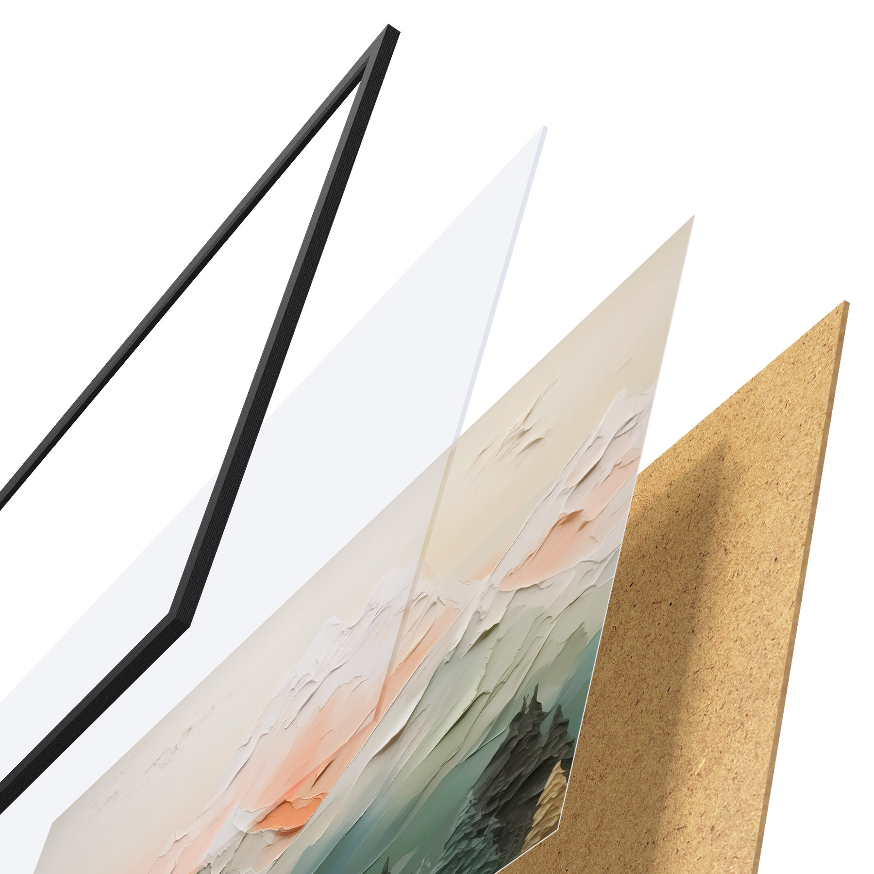 De poster bestaat uit een frame, plexiglas, geprinte afbeelding en spaanplaat achterkant. De poster kan meteen aan de muur worden gehangen dankzij de bevestigingen op de achterkant.