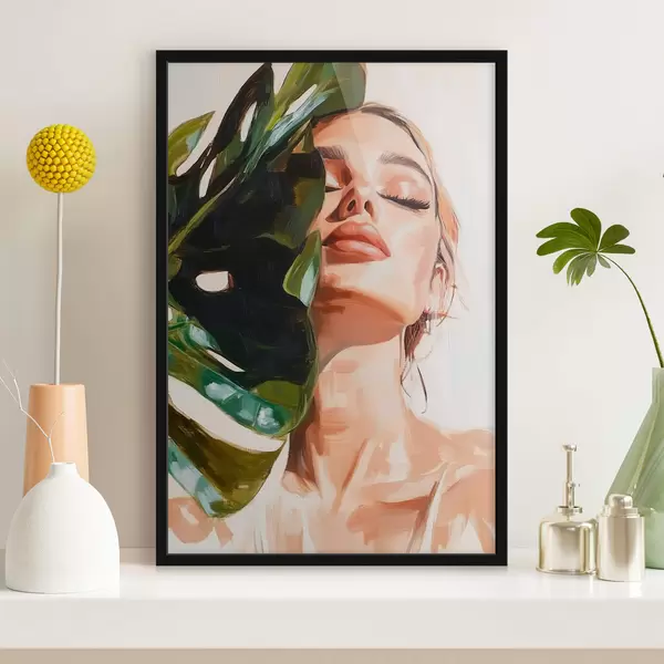 Poster Portret van een vrouw met een monsterablad met imitatie penseelstreken Nr f42597