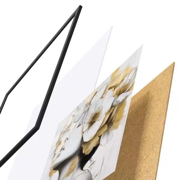 De poster bestaat uit een frame, plexiglas, geprinte afbeelding en spaanplaat achterkant. De poster kan meteen aan de muur worden gehangen dankzij de bevestigingen op de achterkant.