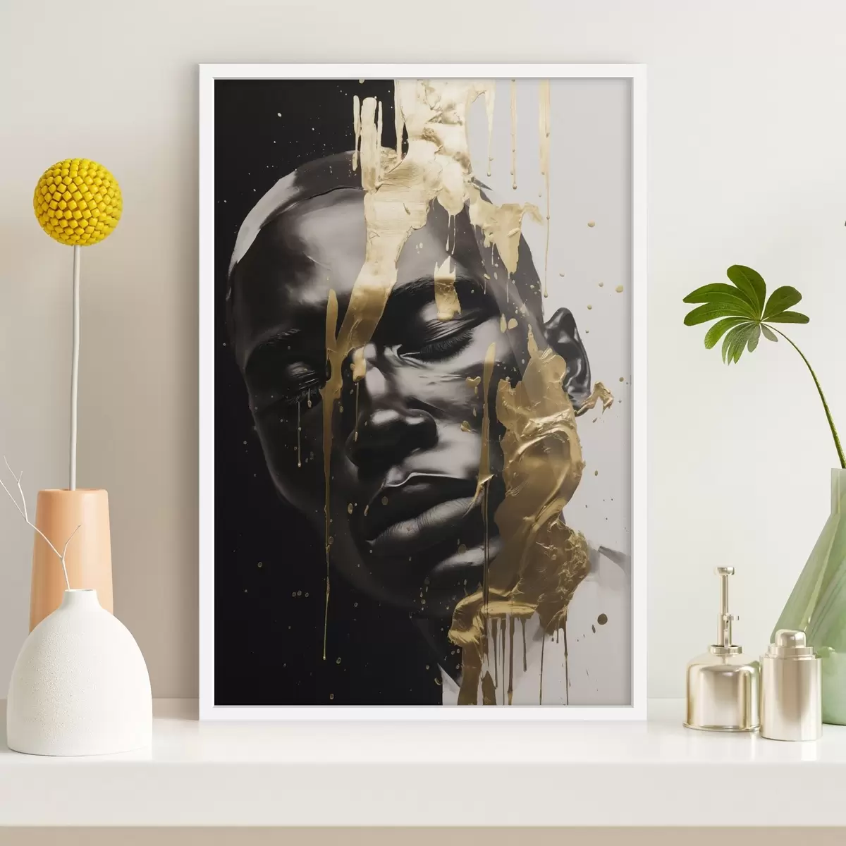 Poster Een abstract portret van een man in zachte zwart-wit tinten, benadrukt door heldere warmgekleurde penseelstreken die een dynamisch effect creëren. Nr f42623