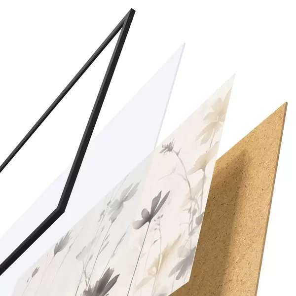 De poster bestaat uit een frame, plexiglas, geprinte afbeelding en spaanplaat achterkant. De poster kan meteen aan de muur worden gehangen dankzij de bevestigingen op de achterkant.