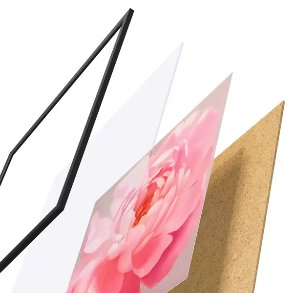 De poster bestaat uit een frame, plexiglas, geprinte afbeelding en spaanplaat achterkant. De poster kan meteen aan de muur worden gehangen dankzij de bevestigingen op de achterkant.