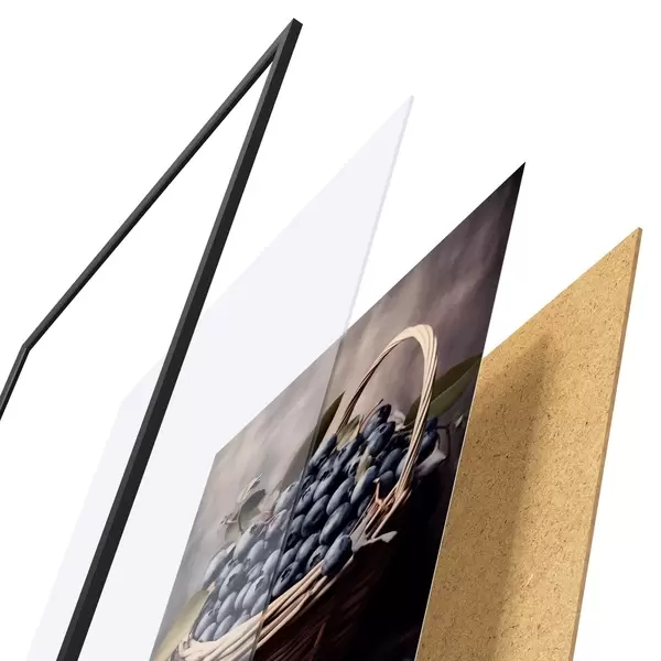 De poster bestaat uit een frame, plexiglas, geprinte afbeelding en spaanplaat achterkant. De poster kan meteen aan de muur worden gehangen dankzij de bevestigingen op de achterkant.