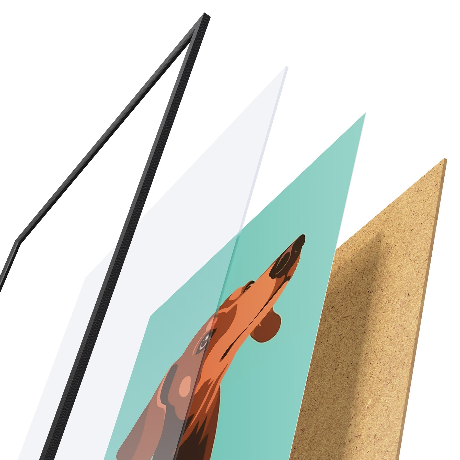 De poster bestaat uit een frame, plexiglas, geprinte afbeelding en spaanplaat achterkant. De poster kan meteen aan de muur worden gehangen dankzij de bevestigingen op de achterkant.
