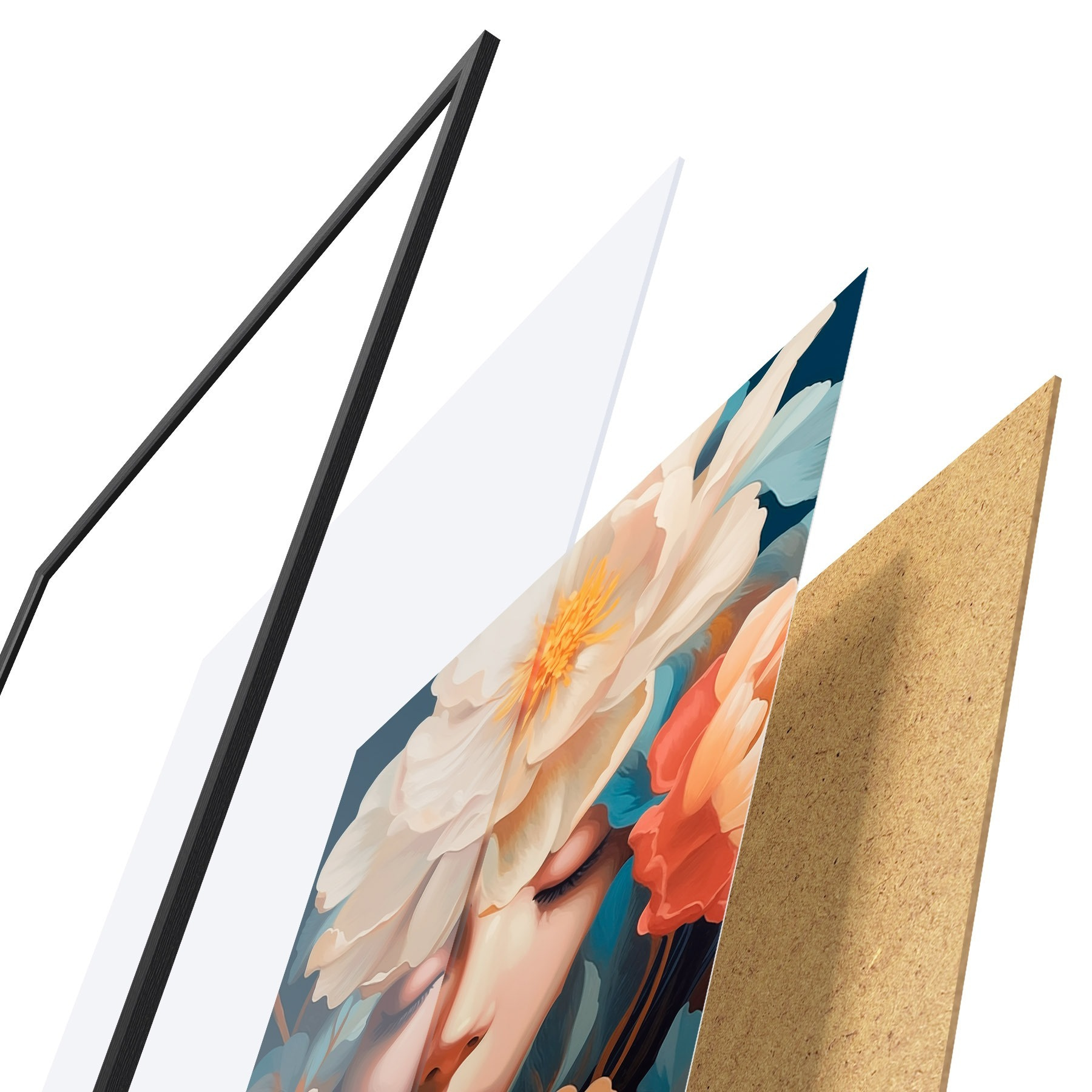 De poster bestaat uit een frame, plexiglas, geprinte afbeelding en spaanplaat achterkant. De poster kan meteen aan de muur worden gehangen dankzij de bevestigingen op de achterkant.