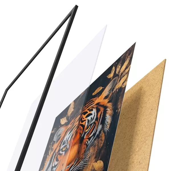 De poster bestaat uit een frame, plexiglas, geprinte afbeelding en spaanplaat achterkant. De poster kan meteen aan de muur worden gehangen dankzij de bevestigingen op de achterkant.