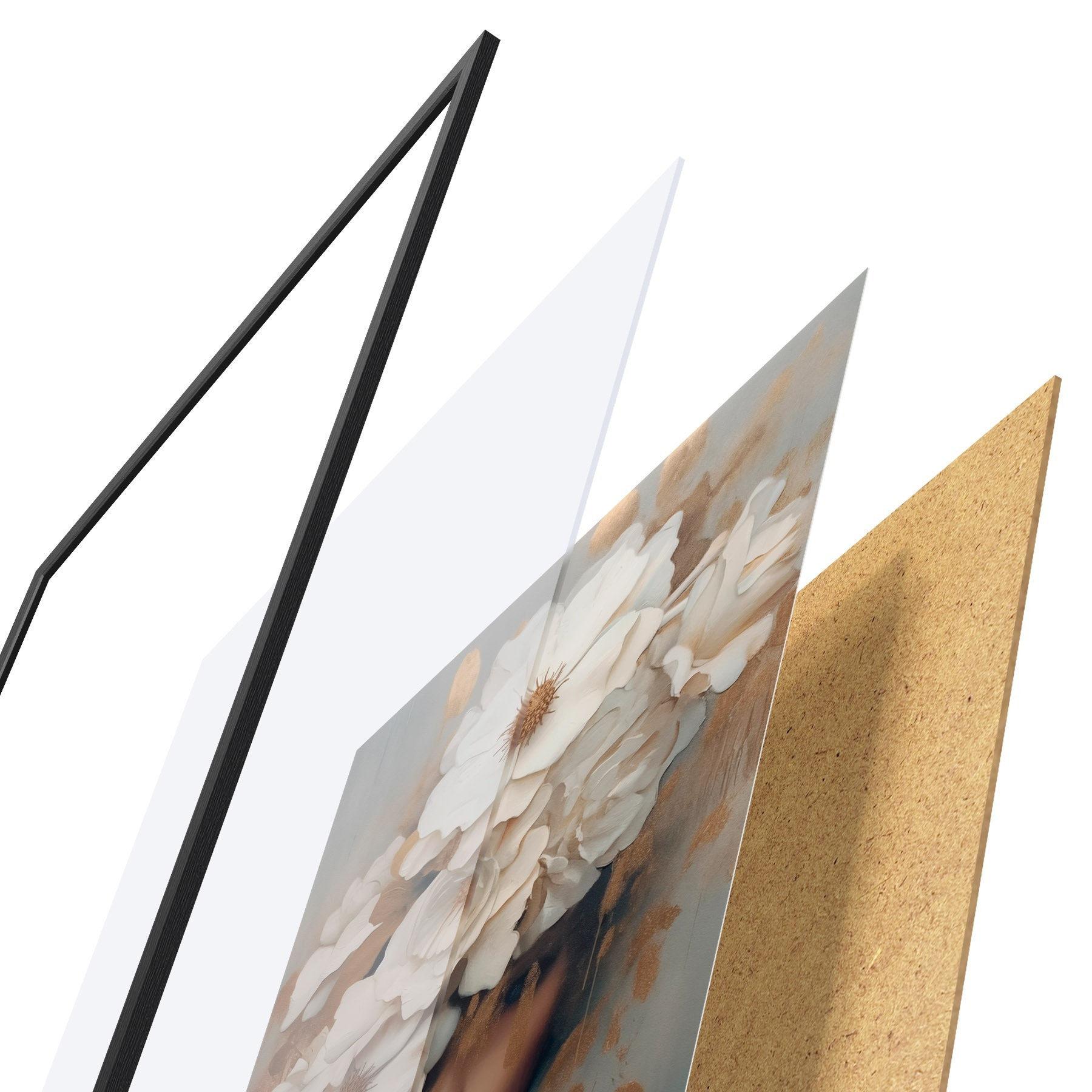 De poster bestaat uit een frame, plexiglas, geprinte afbeelding en spaanplaat achterkant. De poster kan meteen aan de muur worden gehangen dankzij de bevestigingen op de achterkant.