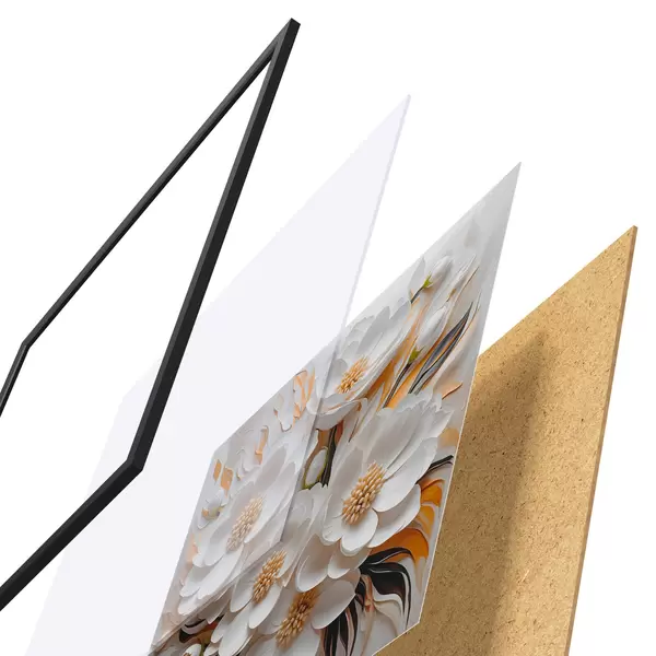 De poster bestaat uit een frame, plexiglas, geprinte afbeelding en spaanplaat achterkant. De poster kan meteen aan de muur worden gehangen dankzij de bevestigingen op de achterkant.