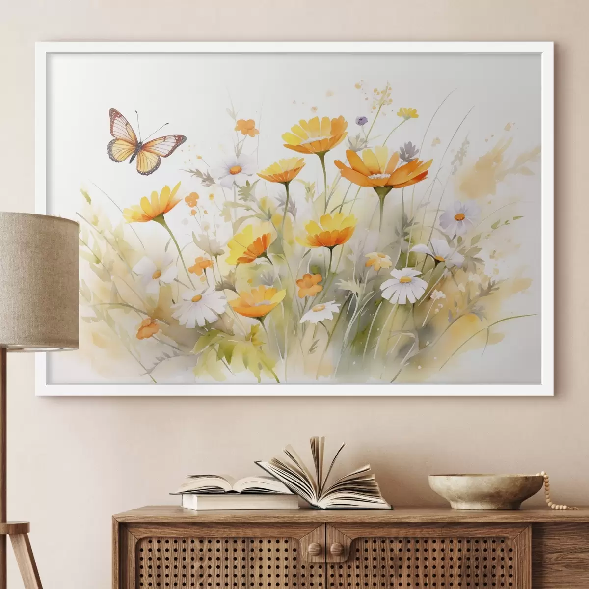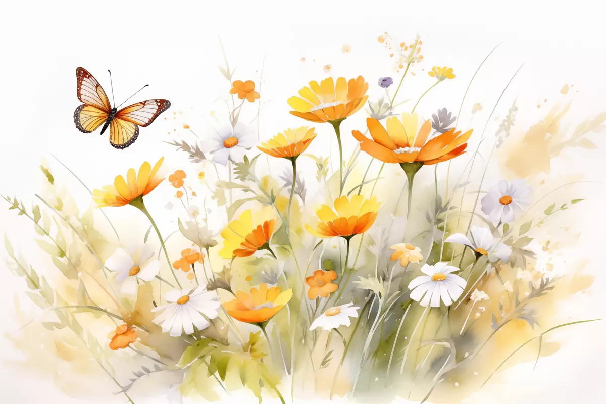 Poster Een levendig aquarelachtig bloemenveld met oranje en witte madeliefjes, met een vlinder fladderend in de buurt Nr f42714