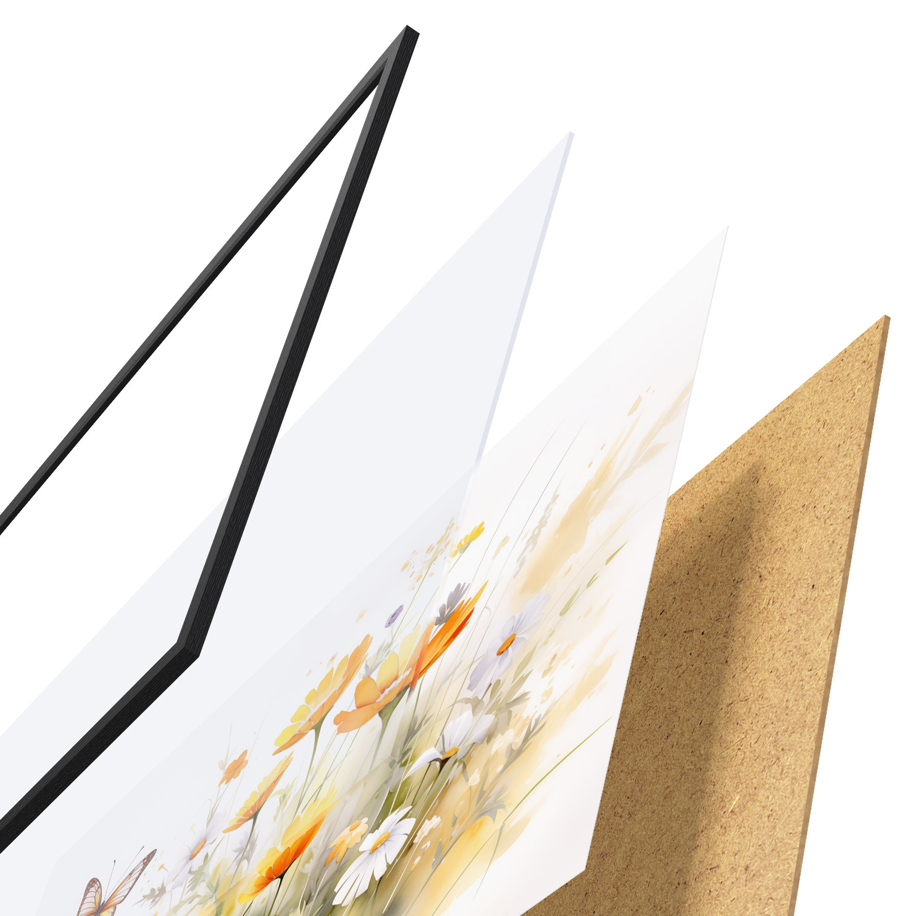De poster bestaat uit een frame, plexiglas, geprinte afbeelding en spaanplaat achterkant. De poster kan meteen aan de muur worden gehangen dankzij de bevestigingen op de achterkant.