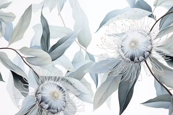 Poster Gedetailleerde botanische illustratie van eucaliptusbloemen met witte filamenten, omringd door zachte, lichtgroene bladeren Nr f42725