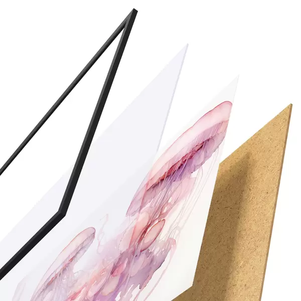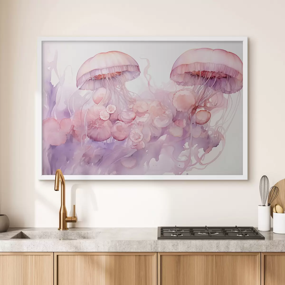 Poster Roze kwallen drijvend in een werveling van zachtroze en paarse tinten, omringd door abstracte vormen Nr f42730