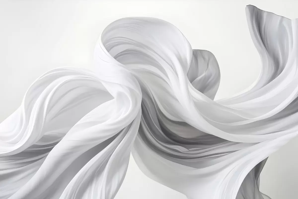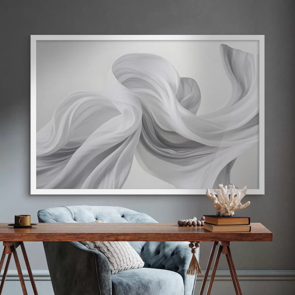 Poster Vloeiende witte en grijze stofachtige vormen die wervelen en verstrengelen tegen een lichte achtergrond Nr f42732