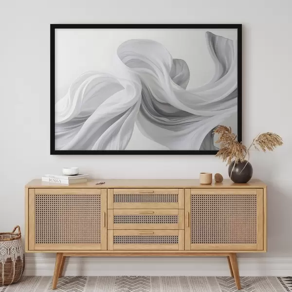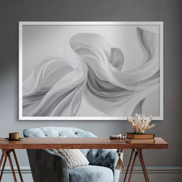 Poster Vloeiende witte en grijze stofachtige vormen die wervelen en verstrengelen tegen een lichte achtergrond f42732