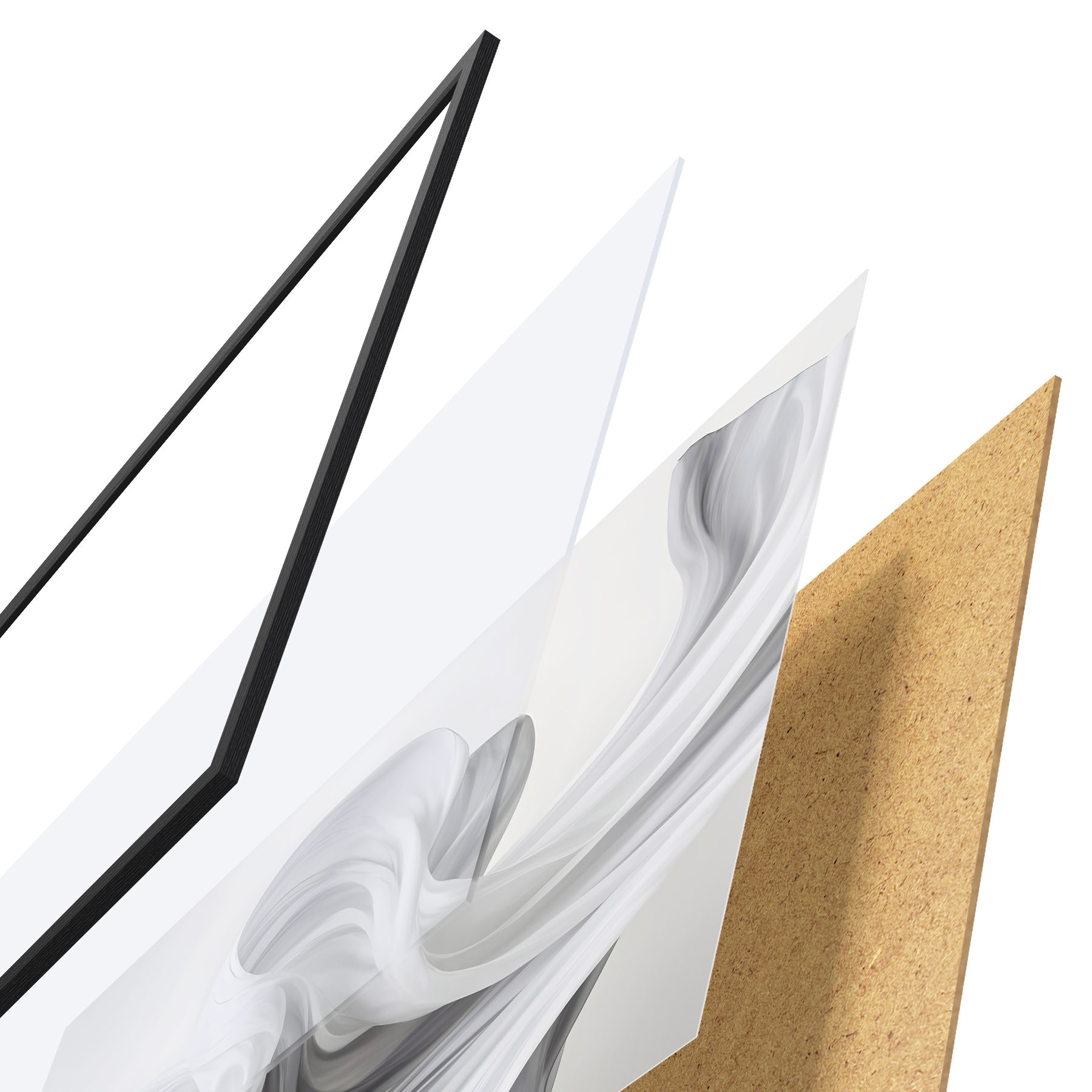 De poster bestaat uit een frame, plexiglas, geprinte afbeelding en spaanplaat achterkant. De poster kan meteen aan de muur worden gehangen dankzij de bevestigingen op de achterkant.
