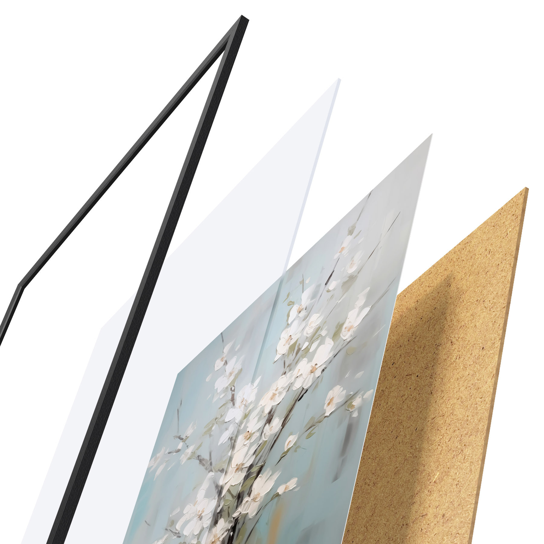 De poster bestaat uit een frame, plexiglas, geprinte afbeelding en spaanplaat achterkant. De poster kan meteen aan de muur worden gehangen dankzij de bevestigingen op de achterkant.