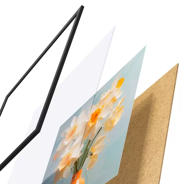 De poster bestaat uit een frame, plexiglas, geprinte afbeelding en spaanplaat achterkant. De poster kan meteen aan de muur worden gehangen dankzij de bevestigingen op de achterkant.