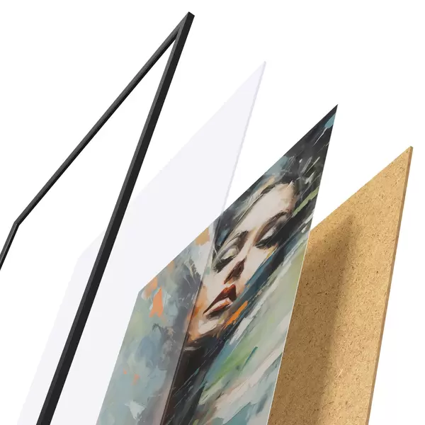 De poster bestaat uit een frame, plexiglas, geprinte afbeelding en spaanplaat achterkant. De poster kan meteen aan de muur worden gehangen dankzij de bevestigingen op de achterkant.