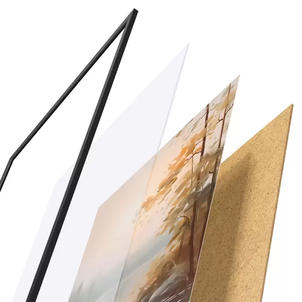De poster bestaat uit een frame, plexiglas, geprinte afbeelding en spaanplaat achterkant. De poster kan meteen aan de muur worden gehangen dankzij de bevestigingen op de achterkant.