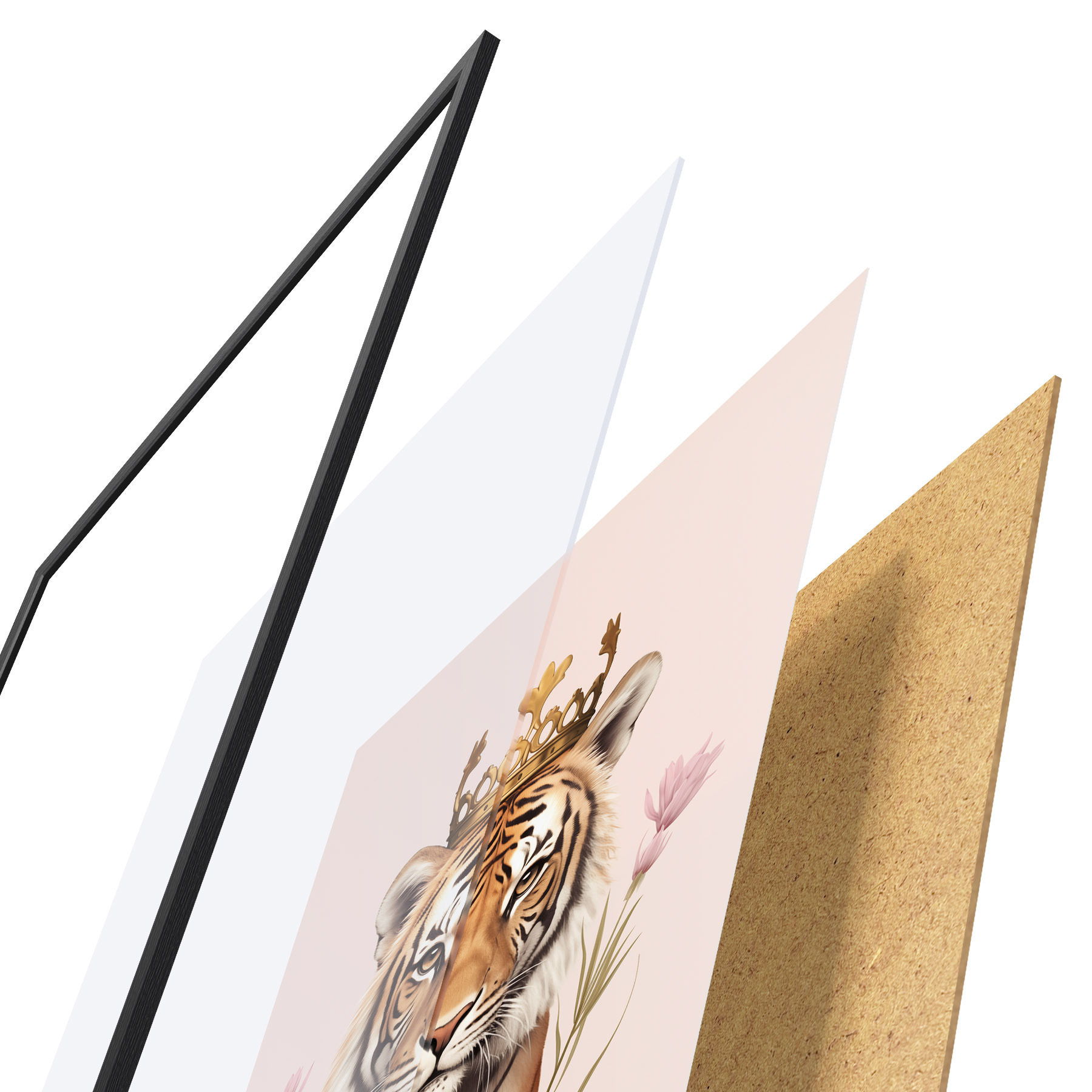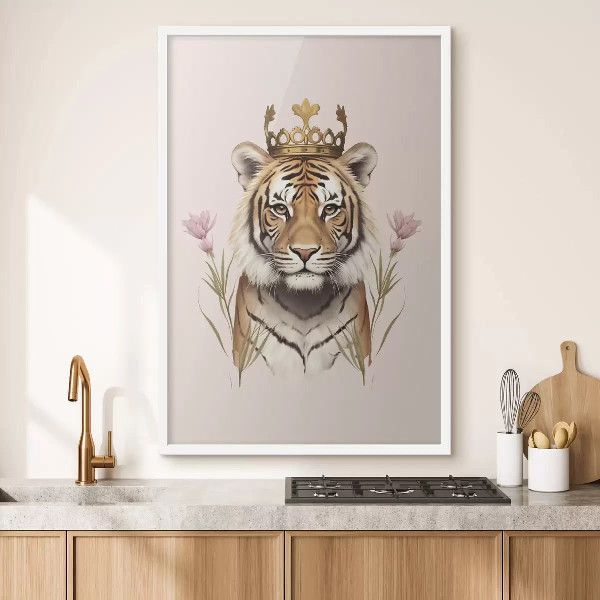 Poster Tijger met kroon, roze achtergrond, tulpenbloemen Nr f42782