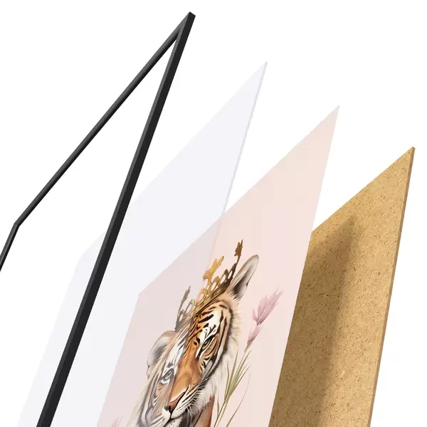 De poster bestaat uit een frame, plexiglas, geprinte afbeelding en spaanplaat achterkant. De poster kan meteen aan de muur worden gehangen dankzij de bevestigingen op de achterkant.