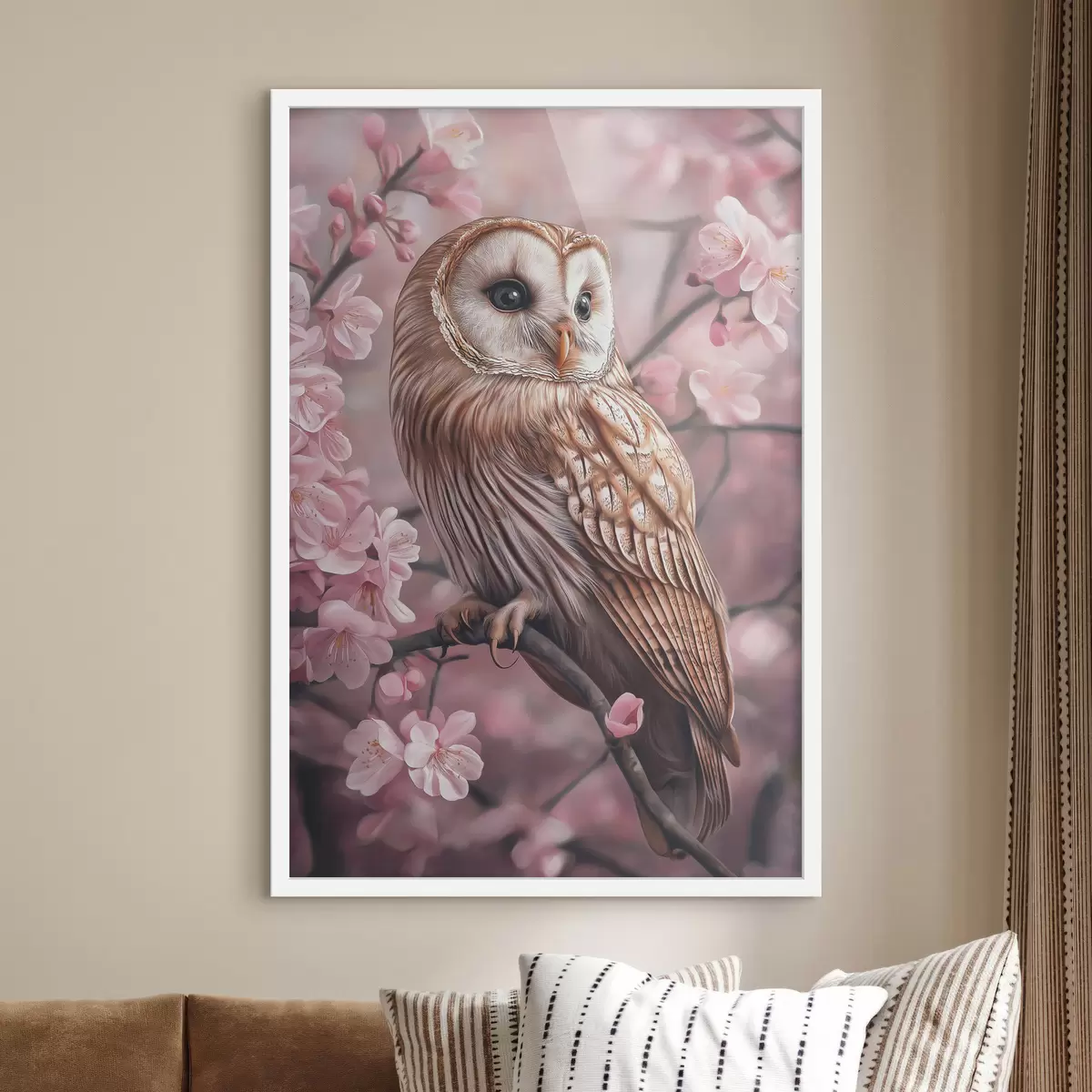 Poster Uil op de kersenboom, roze bloemen, realisme, natuur Nr f42785