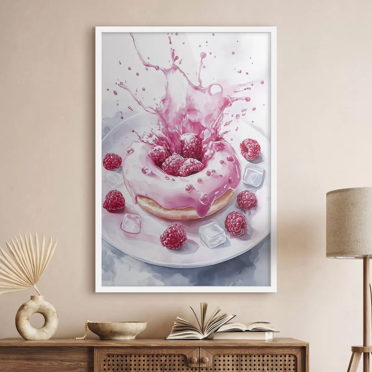 Poster Heerlijke donut op het bord, sprankelende room, frambozen, ijs f42788