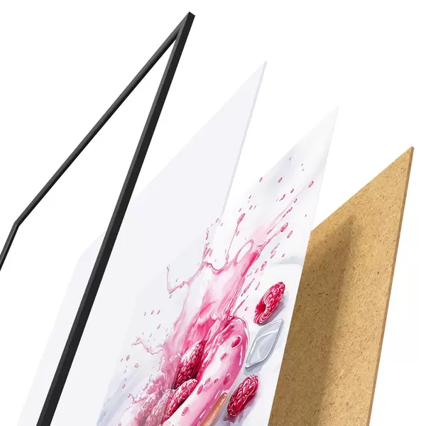 De poster bestaat uit een frame, plexiglas, geprinte afbeelding en spaanplaat achterkant. De poster kan meteen aan de muur worden gehangen dankzij de bevestigingen op de achterkant.