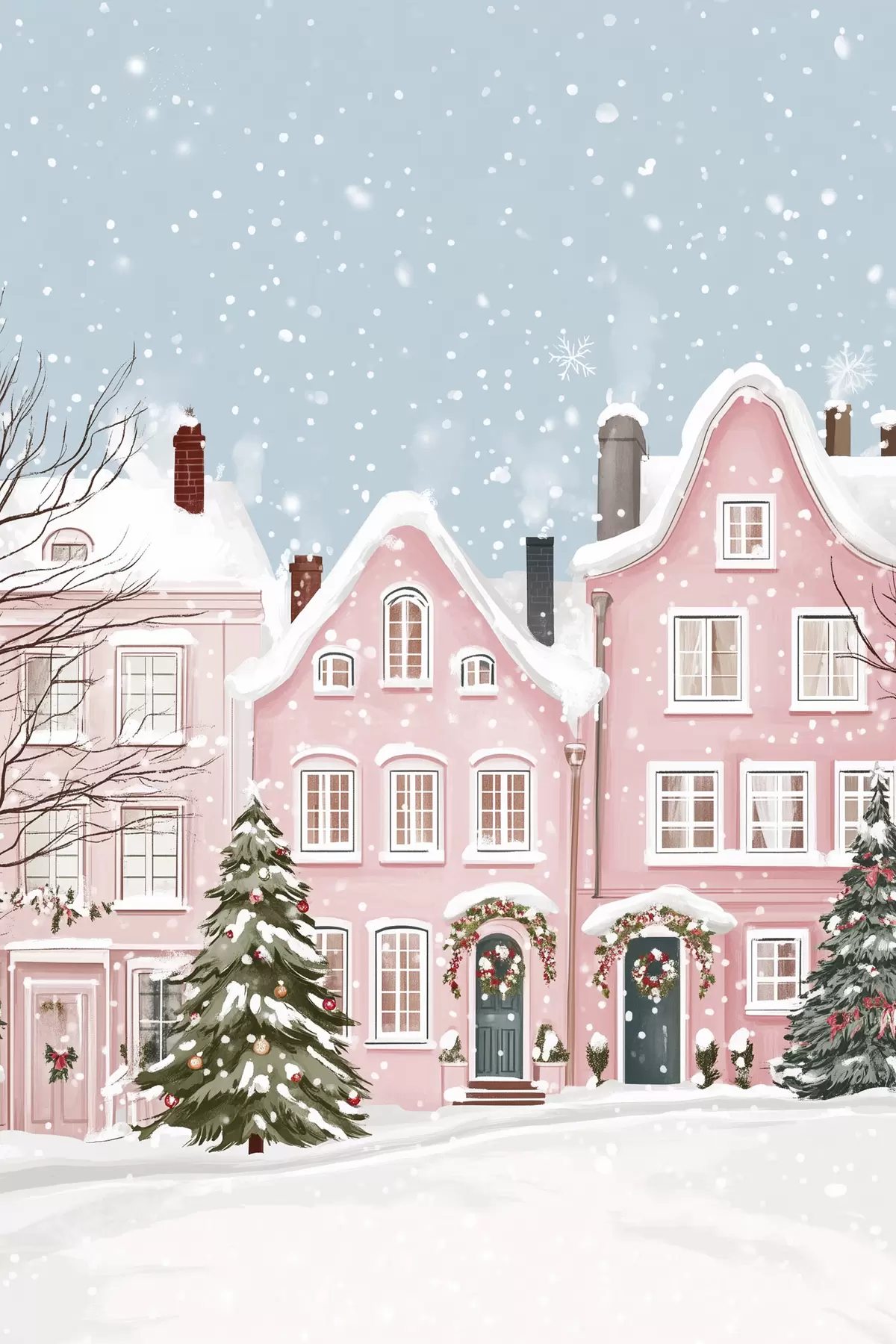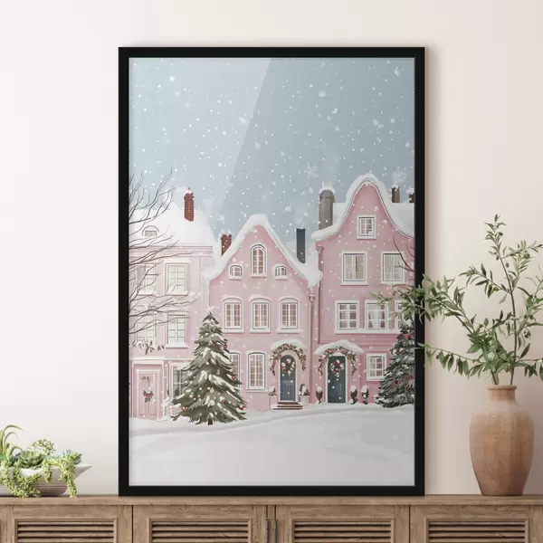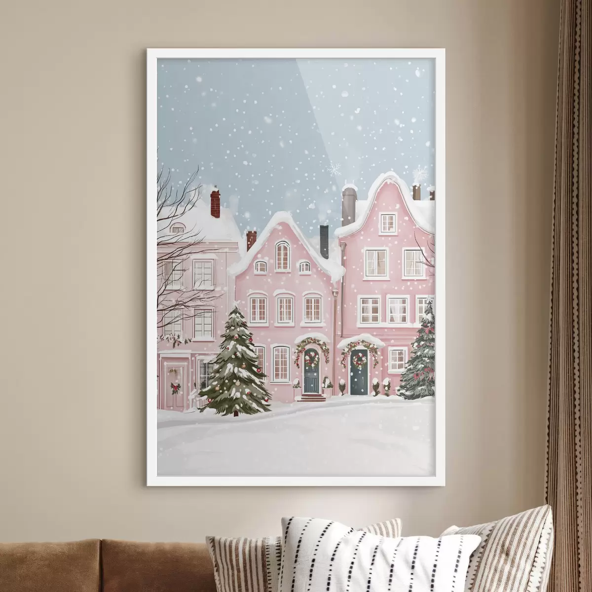 Poster Mooie stad met schattige roze huizen, winterse esthetiek, sneeuwvlokken Nr f42793
