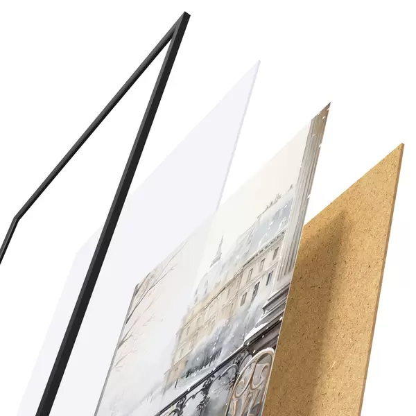 De poster bestaat uit een frame, plexiglas, geprinte afbeelding en spaanplaat achterkant. De poster kan meteen aan de muur worden gehangen dankzij de bevestigingen op de achterkant.