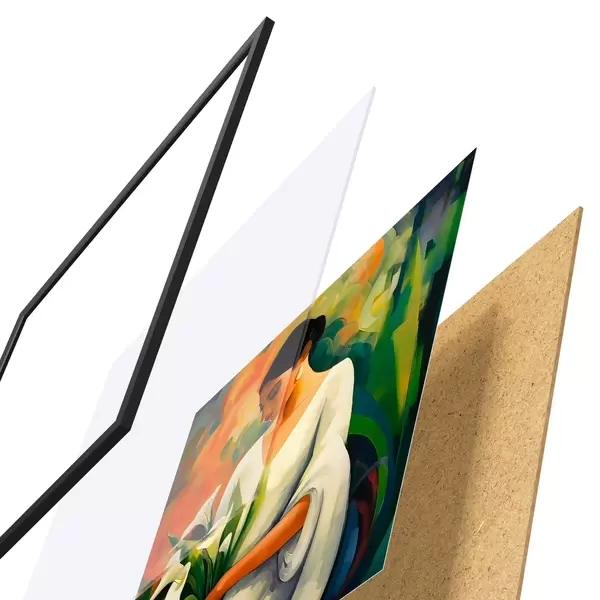 De poster bestaat uit een frame, plexiglas, geprinte afbeelding en spaanplaat achterkant. De poster kan meteen aan de muur worden gehangen dankzij de bevestigingen op de achterkant.