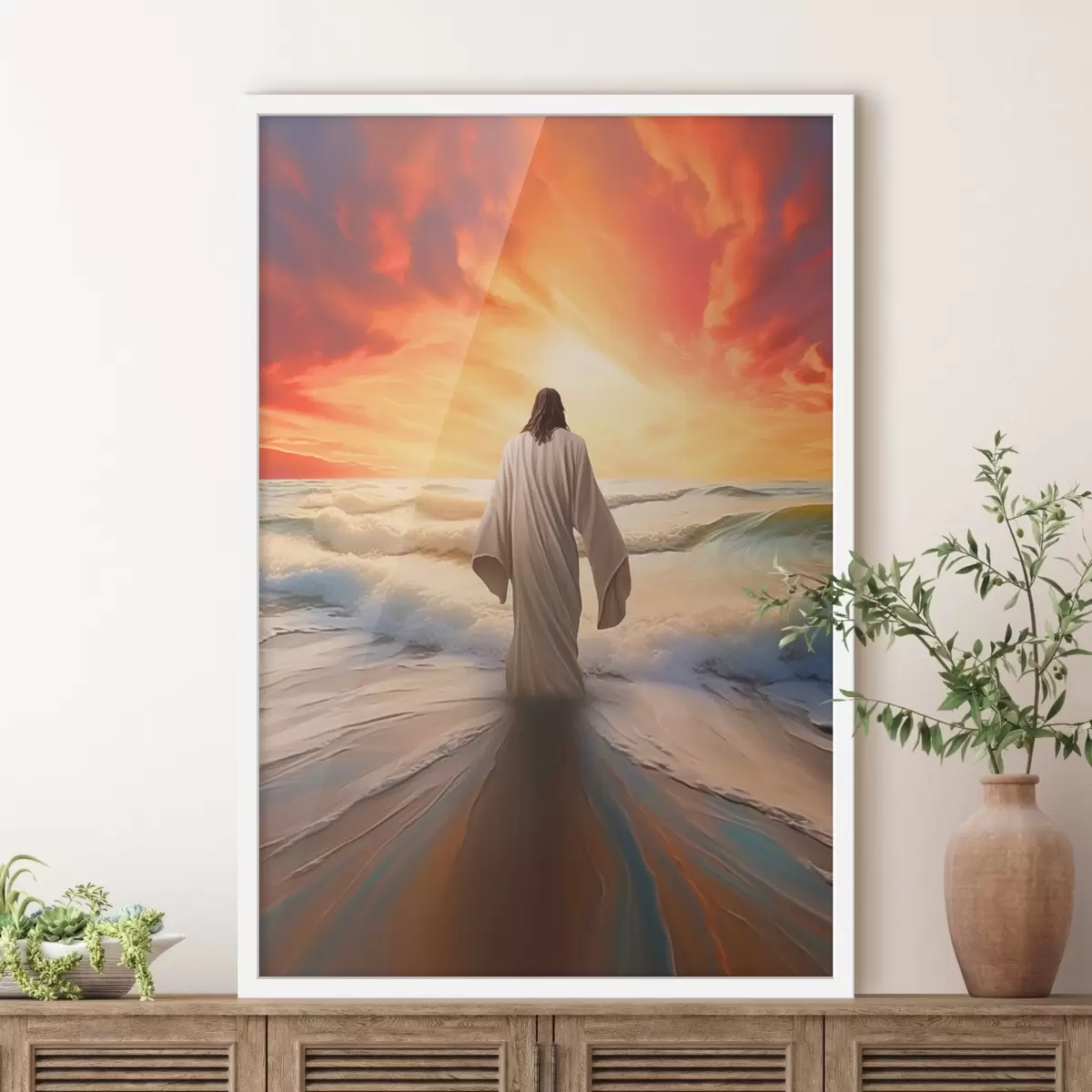 Poster Man bij het water op de achtergrond van zonsondergang Nr f42824