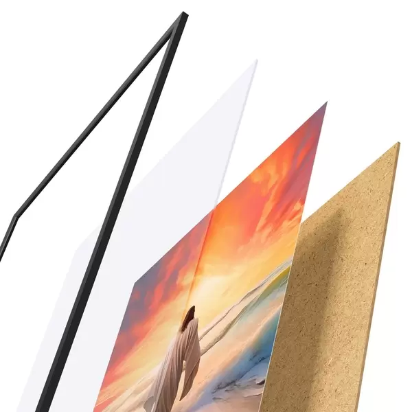 De poster bestaat uit een frame, plexiglas, geprinte afbeelding en spaanplaat achterkant. De poster kan meteen aan de muur worden gehangen dankzij de bevestigingen op de achterkant.