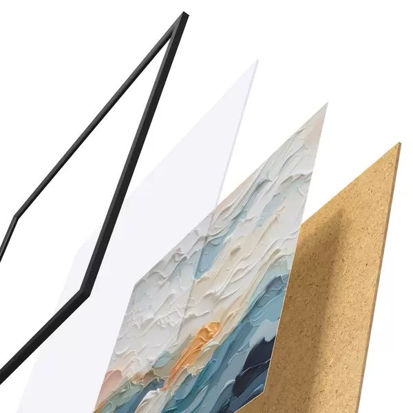 De poster bestaat uit een frame, plexiglas, geprinte afbeelding en spaanplaat achterkant. De poster kan meteen aan de muur worden gehangen dankzij de bevestigingen op de achterkant.