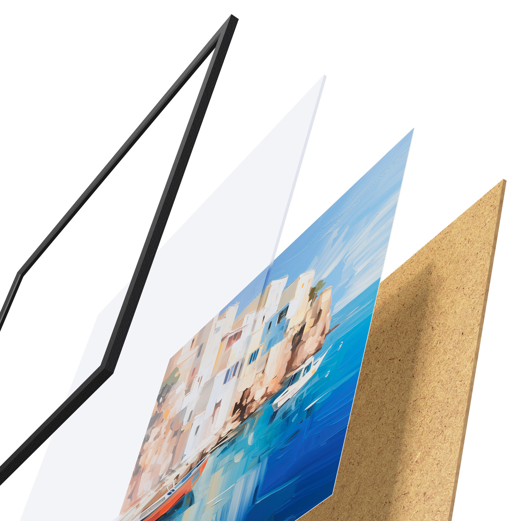 De poster bestaat uit een frame, plexiglas, geprinte afbeelding en spaanplaat achterkant. De poster kan meteen aan de muur worden gehangen dankzij de bevestigingen op de achterkant.