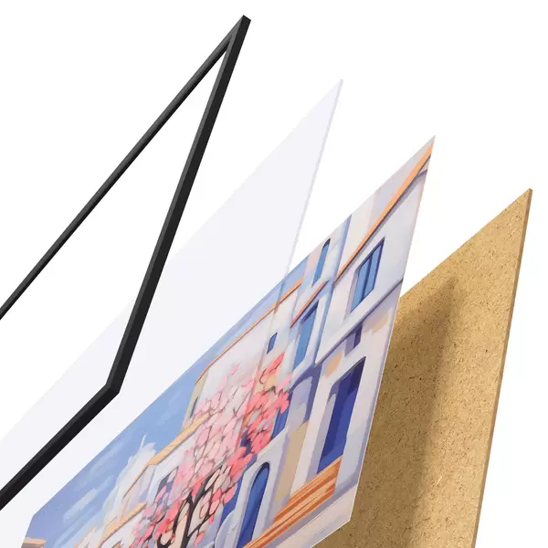De poster bestaat uit een frame, plexiglas, geprinte afbeelding en spaanplaat achterkant. De poster kan meteen aan de muur worden gehangen dankzij de bevestigingen op de achterkant.