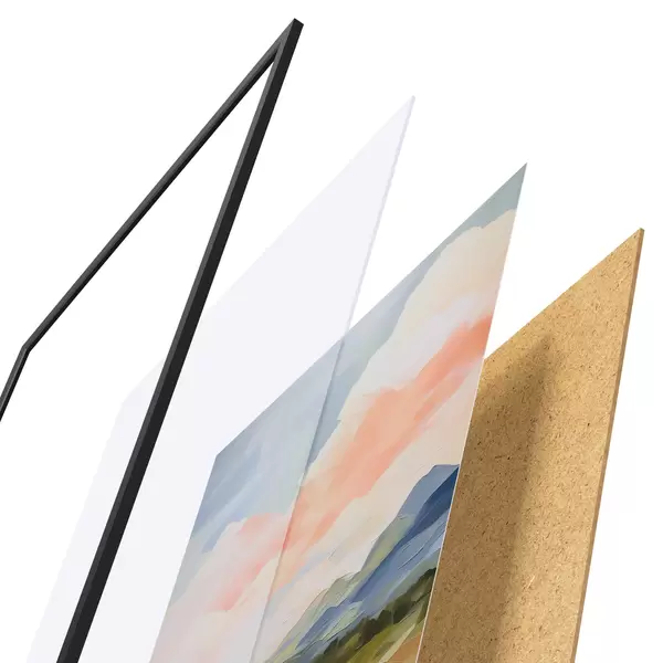 De poster bestaat uit een frame, plexiglas, geprinte afbeelding en spaanplaat achterkant. De poster kan meteen aan de muur worden gehangen dankzij de bevestigingen op de achterkant.