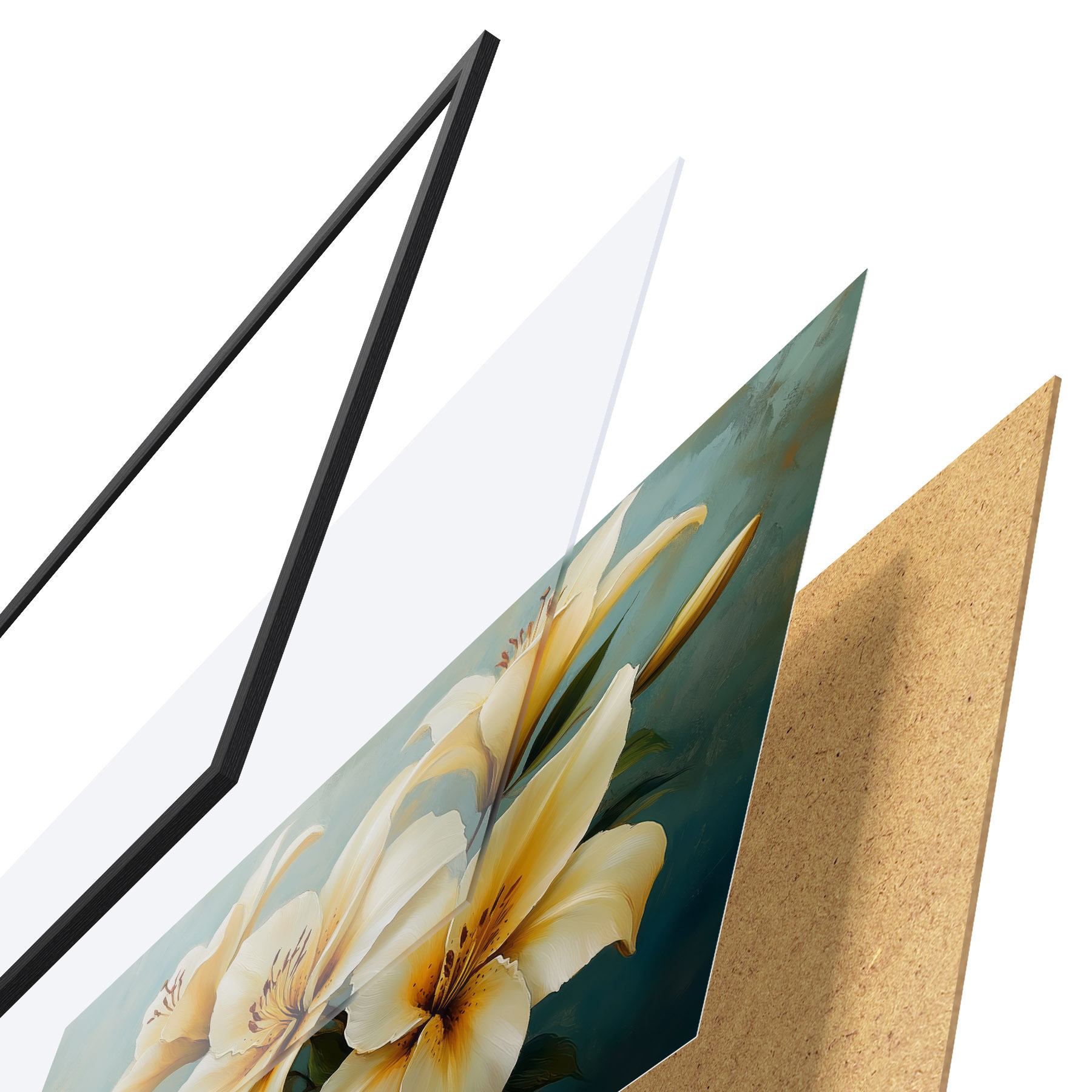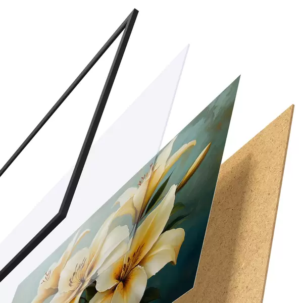 De poster bestaat uit een frame, plexiglas, geprinte afbeelding en spaanplaat achterkant. De poster kan meteen aan de muur worden gehangen dankzij de bevestigingen op de achterkant.