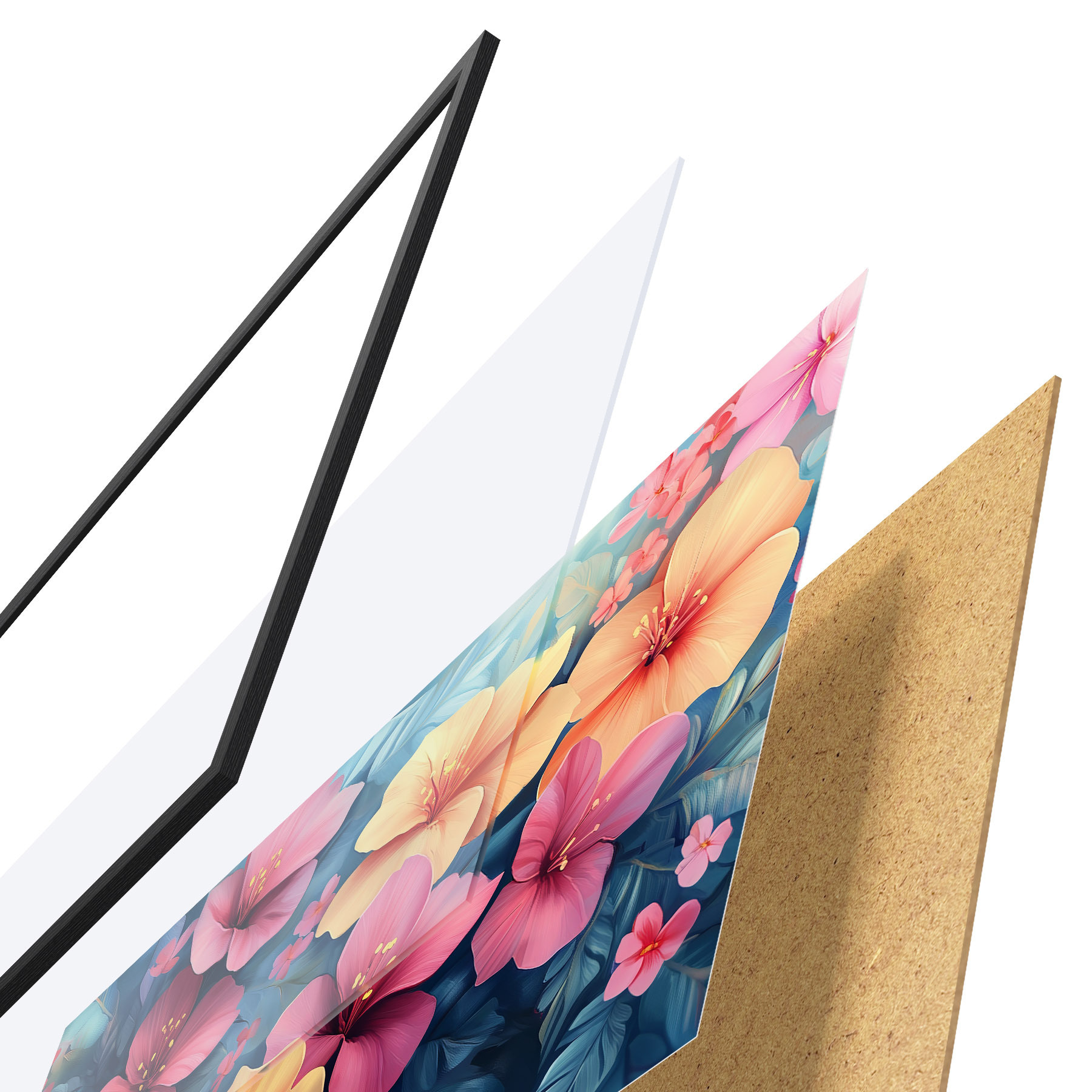 De poster bestaat uit een frame, plexiglas, geprinte afbeelding en spaanplaat achterkant. De poster kan meteen aan de muur worden gehangen dankzij de bevestigingen op de achterkant.