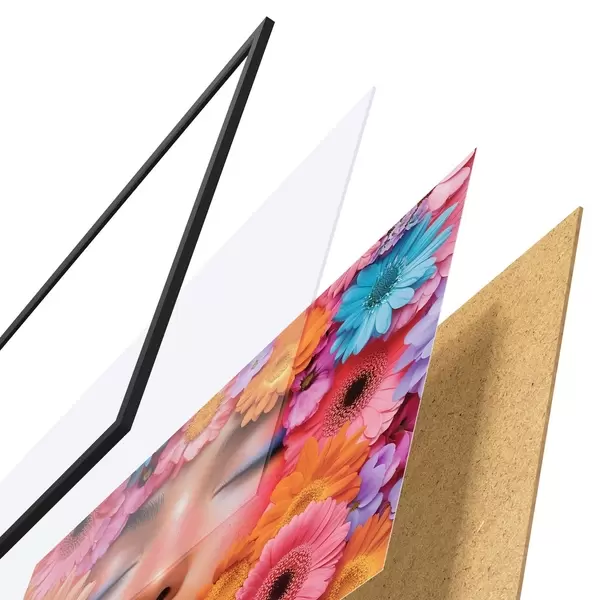 De poster bestaat uit een frame, plexiglas, geprinte afbeelding en spaanplaat achterkant. De poster kan meteen aan de muur worden gehangen dankzij de bevestigingen op de achterkant.