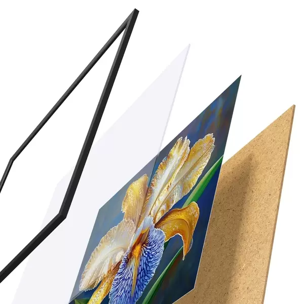 De poster bestaat uit een frame, plexiglas, geprinte afbeelding en spaanplaat achterkant. De poster kan meteen aan de muur worden gehangen dankzij de bevestigingen op de achterkant.