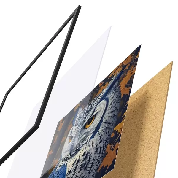 De poster bestaat uit een frame, plexiglas, geprinte afbeelding en spaanplaat achterkant. De poster kan meteen aan de muur worden gehangen dankzij de bevestigingen op de achterkant.