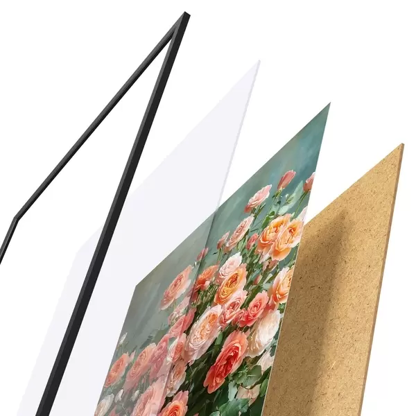 De poster bestaat uit een frame, plexiglas, geprinte afbeelding en spaanplaat achterkant. De poster kan meteen aan de muur worden gehangen dankzij de bevestigingen op de achterkant.