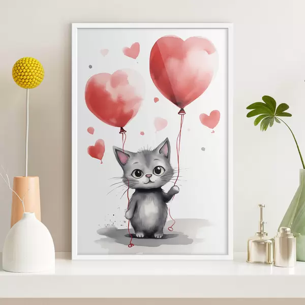 Poster Schattig katje met ballonnen in de vorm van hartjes Nr f42871