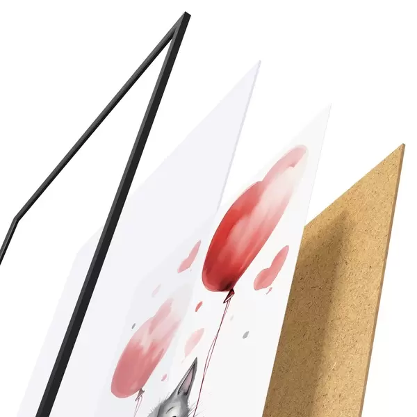 De poster bestaat uit een frame, plexiglas, geprinte afbeelding en spaanplaat achterkant. De poster kan meteen aan de muur worden gehangen dankzij de bevestigingen op de achterkant.