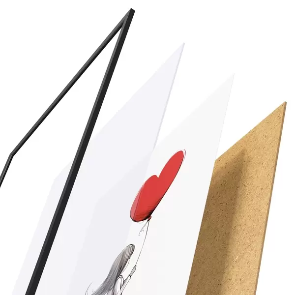 De poster bestaat uit een frame, plexiglas, geprinte afbeelding en spaanplaat achterkant. De poster kan meteen aan de muur worden gehangen dankzij de bevestigingen op de achterkant.