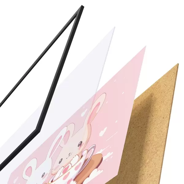 De poster bestaat uit een frame, plexiglas, geprinte afbeelding en spaanplaat achterkant. De poster kan meteen aan de muur worden gehangen dankzij de bevestigingen op de achterkant.