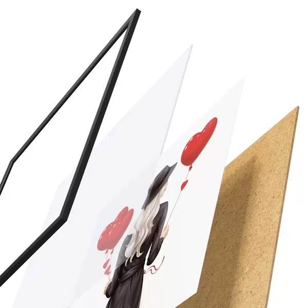 De poster bestaat uit een frame, plexiglas, geprinte afbeelding en spaanplaat achterkant. De poster kan meteen aan de muur worden gehangen dankzij de bevestigingen op de achterkant.